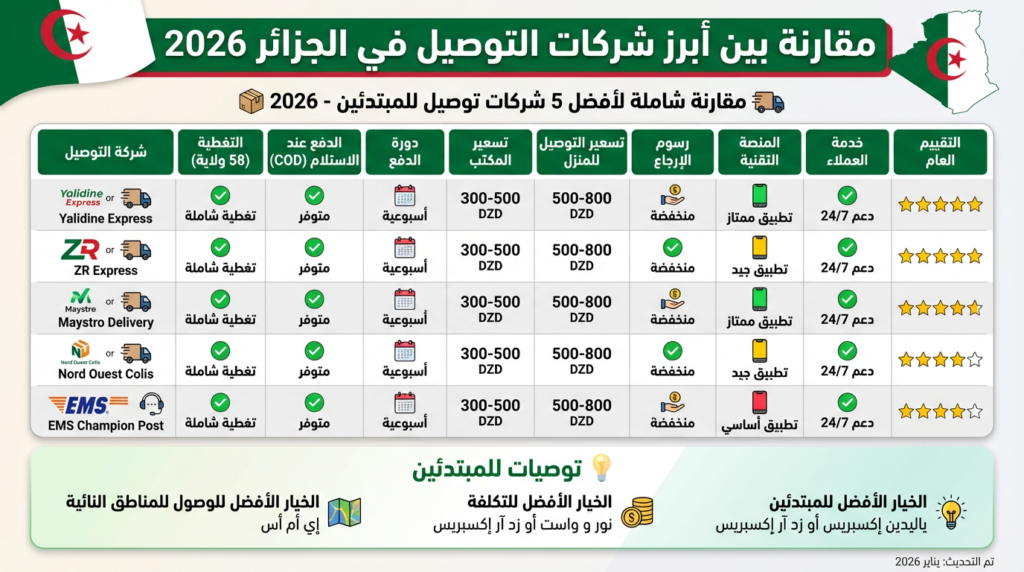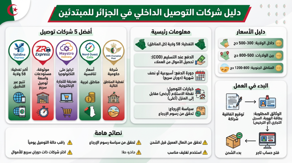 للتعامل مع شركات التوصيل الداخلي في الجزائر كمبتدئ في عام 2026، يمكنك البدء بالتعاقد مع الشركات الكبرى التي توفر منصات رقمية تسهل تتبع الطرود وإدارة الطلبات. أهم الشركات التي ينصح بها للمبتدئين هي: