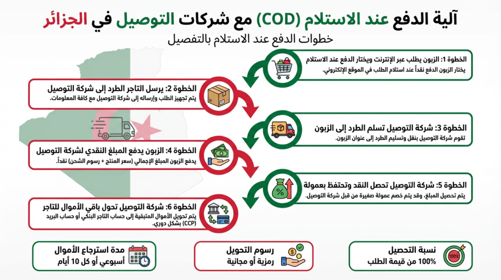 - سياسة الإرجاع (Retour): تأكد من شروط الشركة بخصوص الطرود التي لا يستلمها الزبائن، حيث توفر بعض الشركات عروضاً تتضمن “صفر دينار” على المرتجعات مقابل اشتراك شهري.